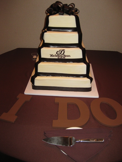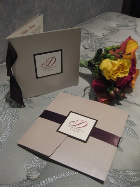 Michele and Brian were married at St Stanislaus in October and their reception was held at Pine Crest Country Club. A little bit of rain (a lot actually!) did not stop it from being a great day! The day started with hair done by Golden Scissors and makeup by Emily from Cheekadee. We handled all of their paper products from invitations to placecards, programs, menus and photo upload cards. Lawrence James was there to capture all the photos and Martin’s Video captured it all on video. Michele walked down the aisle to beautiful music played by an organist, strings and vocalist from Heart strings. Shannan Holland provided the gorgeous autumn colored florals. Synergetic Sounds made a monogram for the dancefloor which was packed all night thanks to the Chatterband! They played all different types of music and really got everyone up on their feet! Bredenbeck’s made the 4 tier cake that looked like pile of gifts with a bow coming down from the top! The guests were treated to a huge, plentiful candy buffet provided by Suzy’s Candy buffet!