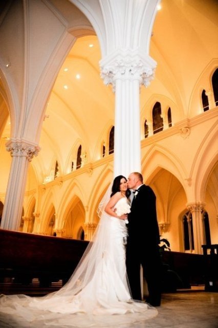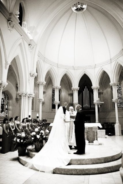 This was a very special winter wedding! Jessica and Ryan were married in December at the breathtakingly beautiful Villanova University Church. The bride, Jessica, is the sister of Jason, the owner of Synergetic Sounds. She is also Synergetic’s Lighting Designer! Needless to say, this wedding had some amazing lighting and other great things that Synergetic offers! They had their dancefloor draped off, LCD screeens with photo displays of the couple (and at one point Santa Claus playing an electric guitar!!). They also had intellegent lighting, which lit up the entire dancefloor and they were able to change the colors throughout the night. Amber uplighting really gave the room a cozy feel and there was a monogram on the outside of the building and on the dancefloor. Mark and Kurt-from Synergetic, too!-kept everyone dancing all night. They also had a photo slideshow after dinner showing pictures of the day, taken by Kevin York, it was fabulous! If you want a more in depth run down of all of the things they had, check out Synergetic Sounds blog, right here. Jason and his staff really outdid themselves! The reception was held at Lazaretto Ballroom. All Occasions Video was there to capture all of the excitement on video. The pictures below are definitely worth checking out! Thanks again so much, Kevin! Great job by all of the professionals that made Jessica and Ryan’s day amazing!!