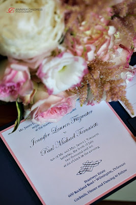 Jen and Paul’s wedding was in July and it started off as a rainy one. Luckily, the sun came out just in time for their beautiful outdoor ceremony at Brantwyn Estate! It turned out to be an amazing day! Meghan Cahill was there to do the girls hair and Kelly from Face the Occasion was there to do their makeup. Everyone looked great! We did their paper products, that were navy blue and pale pink and the florals, done by Flowers by Yukie, matched perfectly! Jen’s bouquet was so pretty! Jennifer Childress Photography was there to get all of the big moments on camera and provided us with the pictures below. As always, a fabulous job by Jenn! Dave from Synergetic Sounds kept the guests dancing all night long. You can see what a great time the guests had in this video clip we blogged last week given to us by the couple’s videographer, Blossom Productions. It as a great wedding and you can tell in the photos and video!