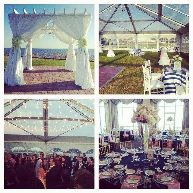 Saturday was also gorgeous at the beach for Kim & Regan’s wedding day at Rehoboth Beach Country Club! The day kicked off with hair and makeup at Made Ya Look Salon, then the bride & groom headed over to the club to get dressed and have their first look. The groom’s first glance of the bride took place on the dock, overlooking the bay and there was nothing but sunshine for this awesome couple! Synergetic Sound and Lighting did an incredible job draping the club’s pergola with fabric and hanging the bride’s chandaliere, and then Bayberry Flowers embellished the ceremony area with gorgeous florals in shades of blush and cream. The ceremony by Judge Lee was very special in that the bride and groom exchanged personal, handwritten vows, and included “Falling In Love is like Owning a Dog” as a reading and also had a Blessing of the Hands. Once the ceremony was over, guests were escorted into a clear topped tent, draped in string lights by Synergetic- which looked amazing!! Kim & Regan did their first dance under the lights, then guests moved upstairs to kick off the reception! We were fortunate enough to get to do their invites, programs, table numbers and more- everything looked gorgeous in shimmery pearl, blush pink, and a nautical navy & white stripe! The dinner tables were dressed in navy pintuck linens, gold beaded chargers, custom personalized menus, and Bayberry created lush and elegant floral arrangements that were dripping with crystals! We also used stemmed votives with floating candles to enhance each centerpiece- it looked gorgeous, highlighted by the pinspots and blush uplighting provided by Synergetic. The club executed a custom menu, created by Kim & Regan, and Sweet Art created a beautiful cake full of bling! The entire day was captured by Serendipity Studios and Black Label Films, who were visiting from Miami, Florida! Matt Bowyer from Synergetic handled the emcee and DJ responsibilities while The Gypsy Wisdom Band rocked the house. It was a magical day, full of beautiful details and lots of love! Congrats to Kim & Regan- wishing you a lifetime of laughter!!
