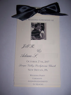 Jill’s Programs January 19, 2008 Jill and Adam were married in late October. They had an engagement photo they wanted to incorporate into her layered programs and asked if we could help. I think they look great in black and white and the thick ribbon adds a touch of elegance.