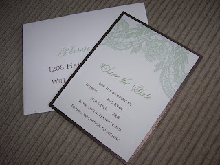 Therese & Ryan’s Save the Dates May 25, 2008 Therese’s wedding gown inspired the lace design of these Save The Date cards. The metallic chocolate backing layer gave them a formal touch. I cannot wait for their wedding in November- she has awesome ideas!