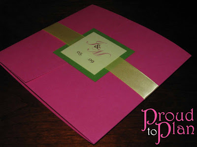 Jackie and Michael’s upcoming spring wedding will be bright and colorful with a vibrant color scheme of fuchsia, lemonade and clover green! We used a die cut punch to carry out their double heart theme, which appeared on their save the dates, too.